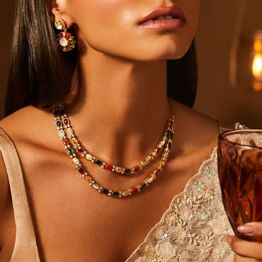 Regular price Rs. 30,729Regular priceUnit price / perSale price Rs. 30,729Badge2:BestsellerEOSS 25Layered NecklaceNavaratnaNecklaceShort NecklaceVaralaxmiYellow Gold -