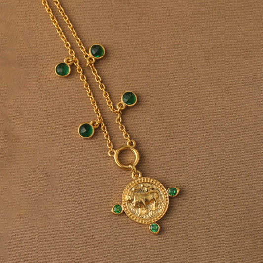 Emerald Taurus Zodiac Coin Gold Plated Silver Necklace