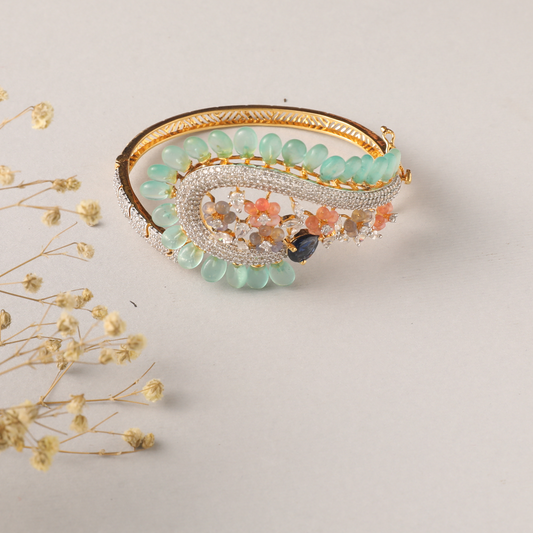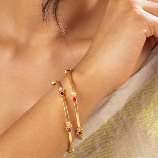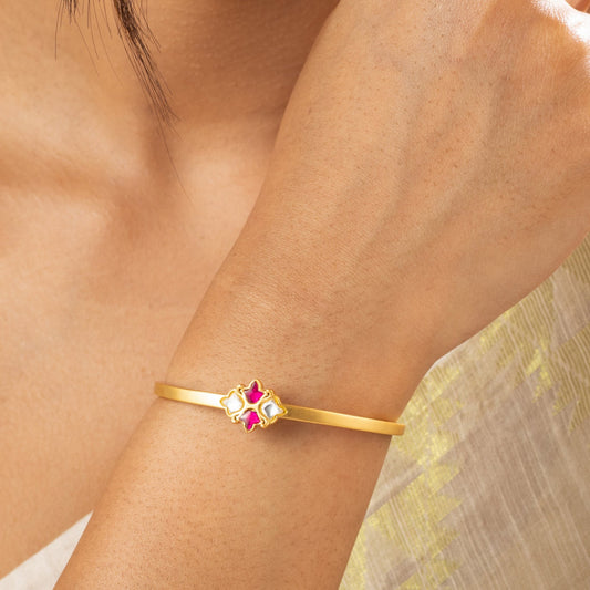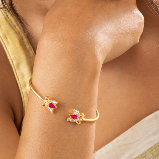 Cuff bangles and bracelets are open on one side and, thus, can be adjusted around the wrist for maximum comfort. Cuff bangles and bracelets can have different designs on adjustable closures to make them more attractive. The adjustable closures can also be studded with gemstones such as Jadau, Kempu, Polki, CZ, Pearl, etc. The Pia Jadau Silver Bracelet has an interesting closure design. The entire bracelet is made of simple gold-plated sterling silver with delicate floral designs on the closure studded with uncut Polki stones in the Jadau style. It can be paired with a watch or other contrasting bangles to create a statement look.
