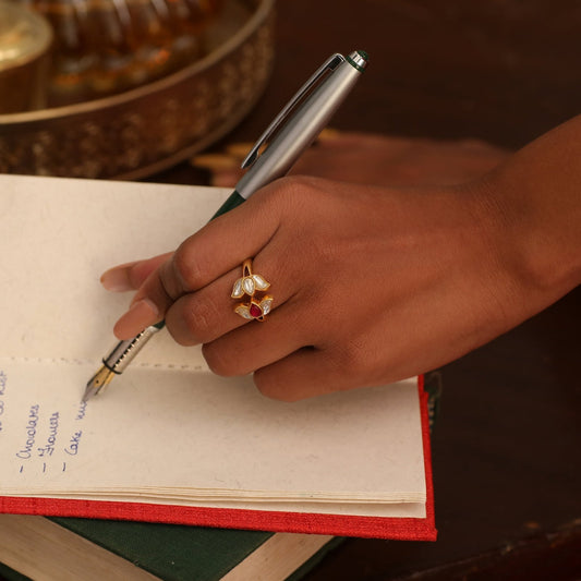 Regular price Rs. 2,309Regular priceUnit price / perSale price Rs. 2,309$50 and UnderBadge2:BestsellerBadge3:Ready To ShipCasualEOSS 10Finger RingsIryaJadauPolki/KundanRakhi GiftingTeejhViharaWhite greenYellow Gold -