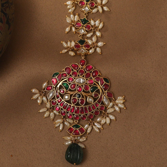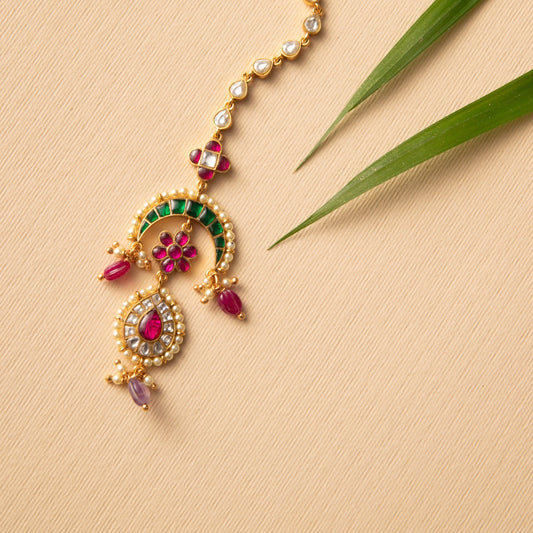 The most attractive feature of the Nala Jadau Silver Maang Tikka is the central lotus flower in full bloom made up of semi-precious pink Kempu stones set within a chand motif. The additional touches of green quartz stones, white Polki stones and layers of tiny pearls on a beautiful gold-plated pure silver frame just add to the glamour of this maang tikka. The Nala Jadau Silver Maang Tikka can be comfortably paired with different ethnic outfits for weddings or simple occasions.