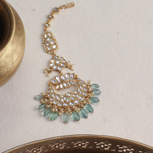 The Kalina Gold Plated Silver Maang Tikka is a perfect example of heirloom silver jewellery in India. Made of gold-plated sterling silver, timeless green beads, tiny cluster pearls, and jadau set white stones, this hair accessory is a must have for any modern bride and will make your bridal look exceptional.