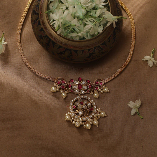 Regular price Rs. 27,489Regular priceUnit price / perSale price Rs. 27,489$100-$250Badge2:BestsellerBadge3:Ready To ShipEOSS 15GoldGuttapusaluJadauKempuNecklacesShort NecklaceTOP 300 2025ViharaWeddingWhite Red Green -