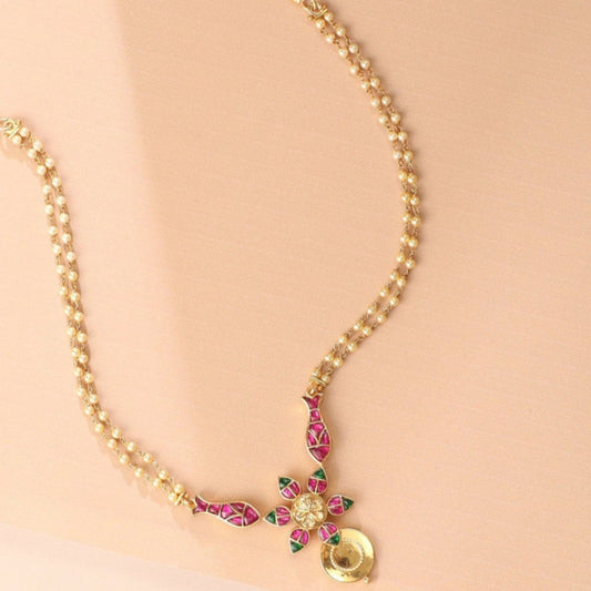 Regular price Rs. 12,829Regular priceUnit price / perSale price Rs. 12,829Badge3:Ready To ShipCasualEOSS 25FloralIryaJadauNecklacesPolki/KundanShort NecklaceTeejhWhite RedYellow Gold -