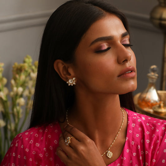 Regular price Rs. 6,279Regular priceUnit price / perSale price Rs. 6,279$50-$100Badge3:Ready To ShipEarringsEOSS 15FloralGoldIryaJadauPolki/KundanRakhi GiftingStudsTeejhWhiteWork -