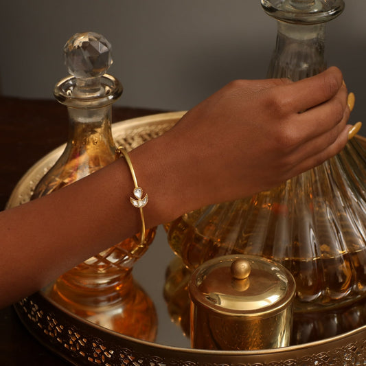 Regular price Rs. 10,629Regular priceUnit price / perSale price Rs. 10,629$50-$100Bangles and BraceletsBracelet CuffsEOSS 25FloralGoldIryaMoissaniteTeejhWeddingWhite -