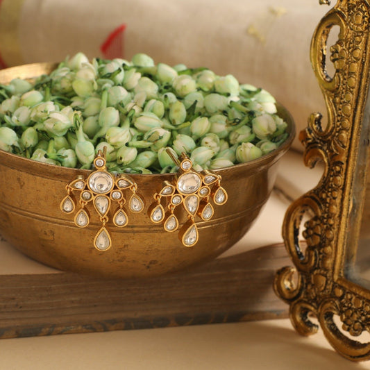 Regular price Rs. 8,039Regular priceUnit price / perSale price Rs. 8,039$50-$100Badge2:BestsellerCasualDrop EarringsEarringsEOSS 15GoldIryaJadauPolki/KundanRakhi GiftingTeejhWhite -