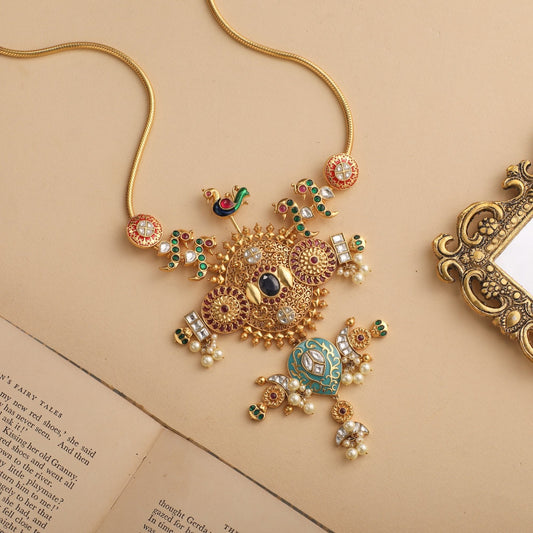Regular price Rs. 72,759Regular priceUnit price / perSale price Rs. 72,759$750-$1000ContemporaryEOSS 25GoldMulti-StoneNecklacesPeacockShort NecklaceViharaWeddingWhite Red Green -