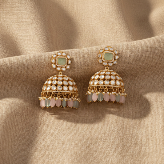 Mrinali Jadau and Pearl chain Gold Plated Silver Jhumka