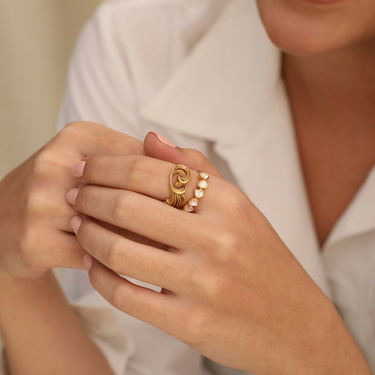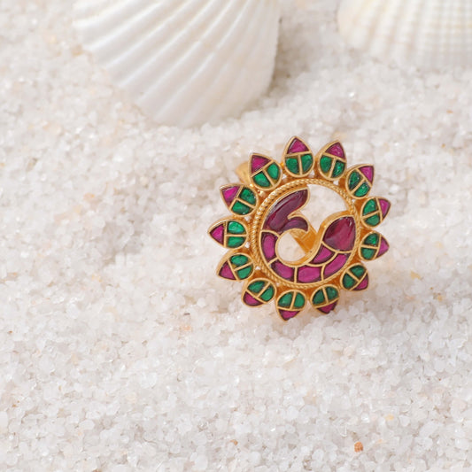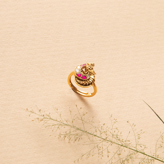 These rings are made in the classical style, with floral and leaf patterns adorning the central structure. They can be embellished with precious stones in different colours or even enamelled to give them a distinct look. The Peony Jadau Finger Ring is designed as a floral bud with Jadau encrusted white stones adding to its elegance. Classic rings are perfect for special occasions such as festivals and wedding celebrations.