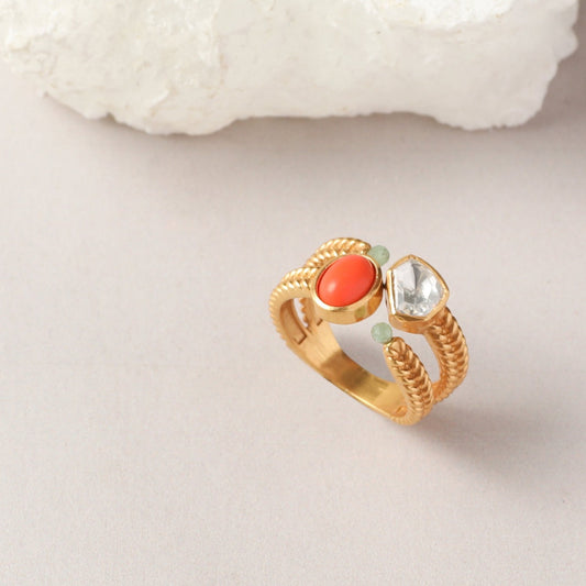 These silver rings open on one side to fit perfectly. The adjustable closure is usually decorated with different patterns and studded with stones, as it is the main feature of the ring. Adjustable silver rings are trendy and can be worn to cocktail parties, weddings, or festive occasions. The Varda Jadau Silver Ring, with its green and white Polki stones studded in the Jadau style, is an excellent ring to pair with your other Polki Jadau jewellery and looks highly chic on special occasions.