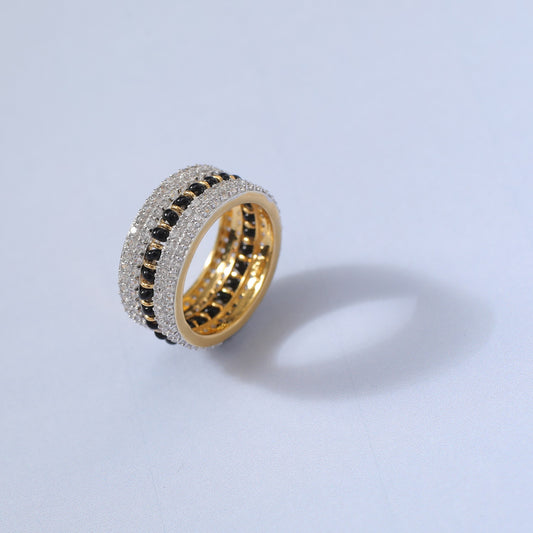 Black bead rings have black beads in their designs. Modern married women wear black bead rings and bracelets instead of mangalsutra or black beads necklaces. Many trendy designs are available in black beads, like the Elegant CZ Silver Black Bead Band Ring. The ring comprises three distinct bands: the sidebands of high-quality CZ stones and the centre band of black beads. This 18K gold-plated Hallmarked sterling silver ring can be worn every day or on casual occasions.