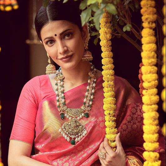 Regular price Rs. 36,879Regular priceUnit price / perSale price Rs. 36,879$250-$500AntiqueAntique Yellow GoldBadge2:BestsellerBadge3:Ready To ShipBridalEOSS 25KempuLong NecklaceMandiraNecklacesTempleTOP 300 2025VaralaxmiWhite green -
