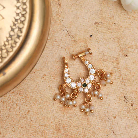 Grace yourself with the elegance and charm of our antique maang-tikkas from the Vihara Collection. The mang-tikkas feature a sparkling sheen of polki and the vibrant hues of kempu stones. Whether you're a bride-to-be looking to add a regal touch to your bridal ensemble or a guest attending a wedding function, the Maang-tikkas in the collection are the perfect hair accessories to complete and complement your wedding wardrobe. Our top pick from the collection is the Mayur Kempu Jadau Silver Maangtika, which features beaded pearls and kempu-studded floral patterns bordered by peacock motifs and charms. This maang-tikka is the perfect hair accessory that can act as a crowning jewel and enhance your overall look with a hint of traditional grandeur for your special day.