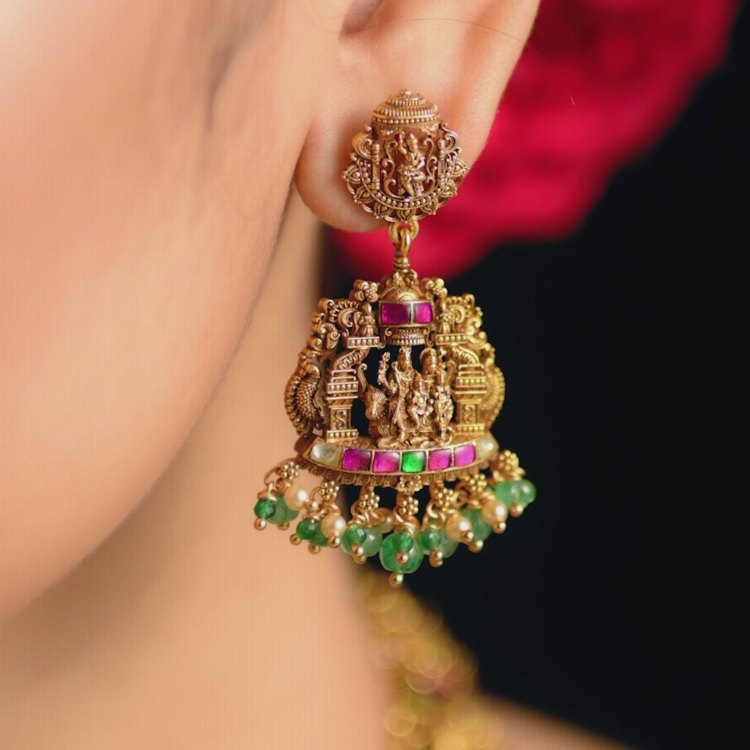 An exceptional temple jewelry piece featuring Lord Shiva with Parvati and their divine family, adorned with kempu stones and guardian motifs including Nandi. This antique necklace set is a masterpiece of traditional craftsmanship, perfect for grand weddings and cultural celebrations. Designed for brides or anyone seeking a statement heirloom, it radiates heritage and devotion in every detail.