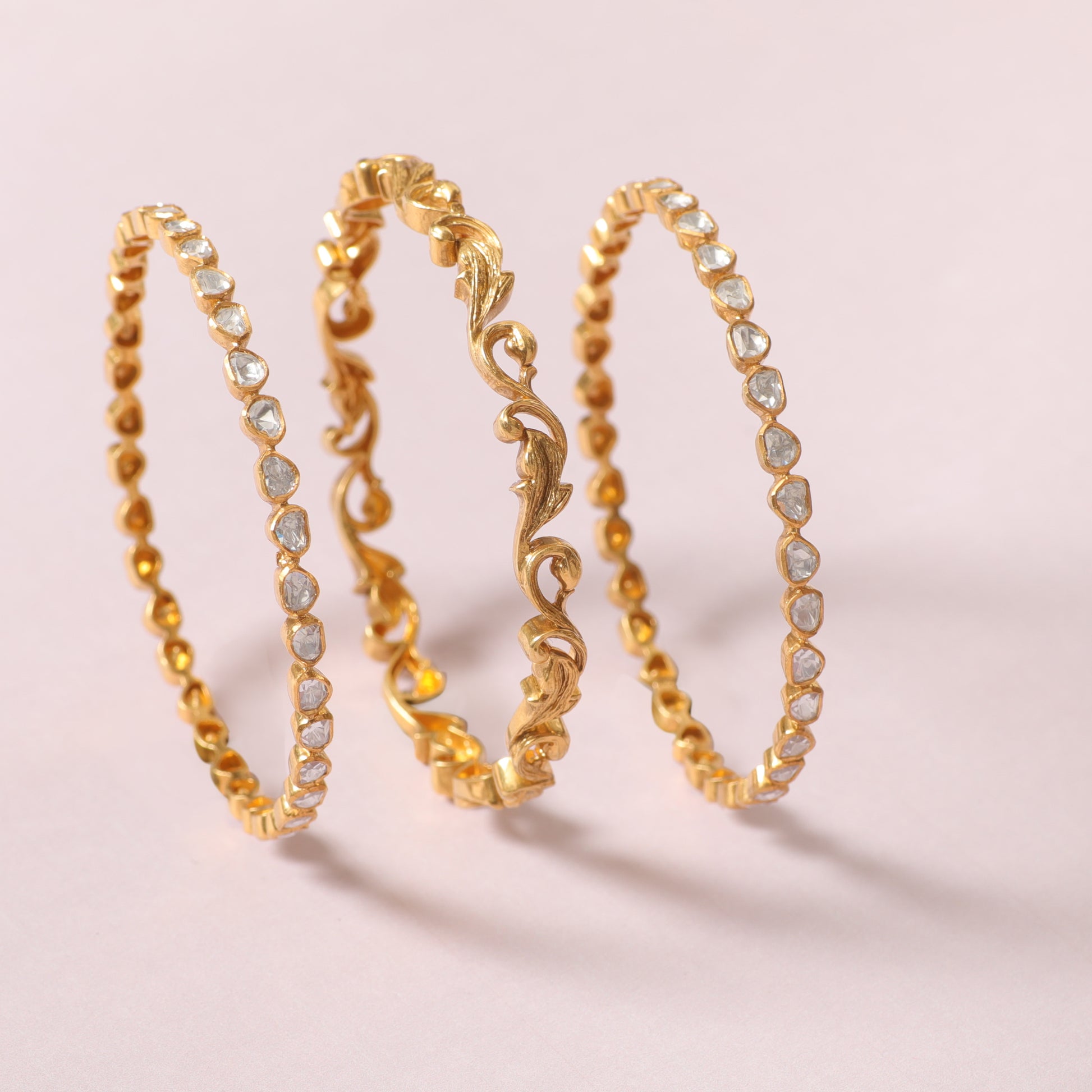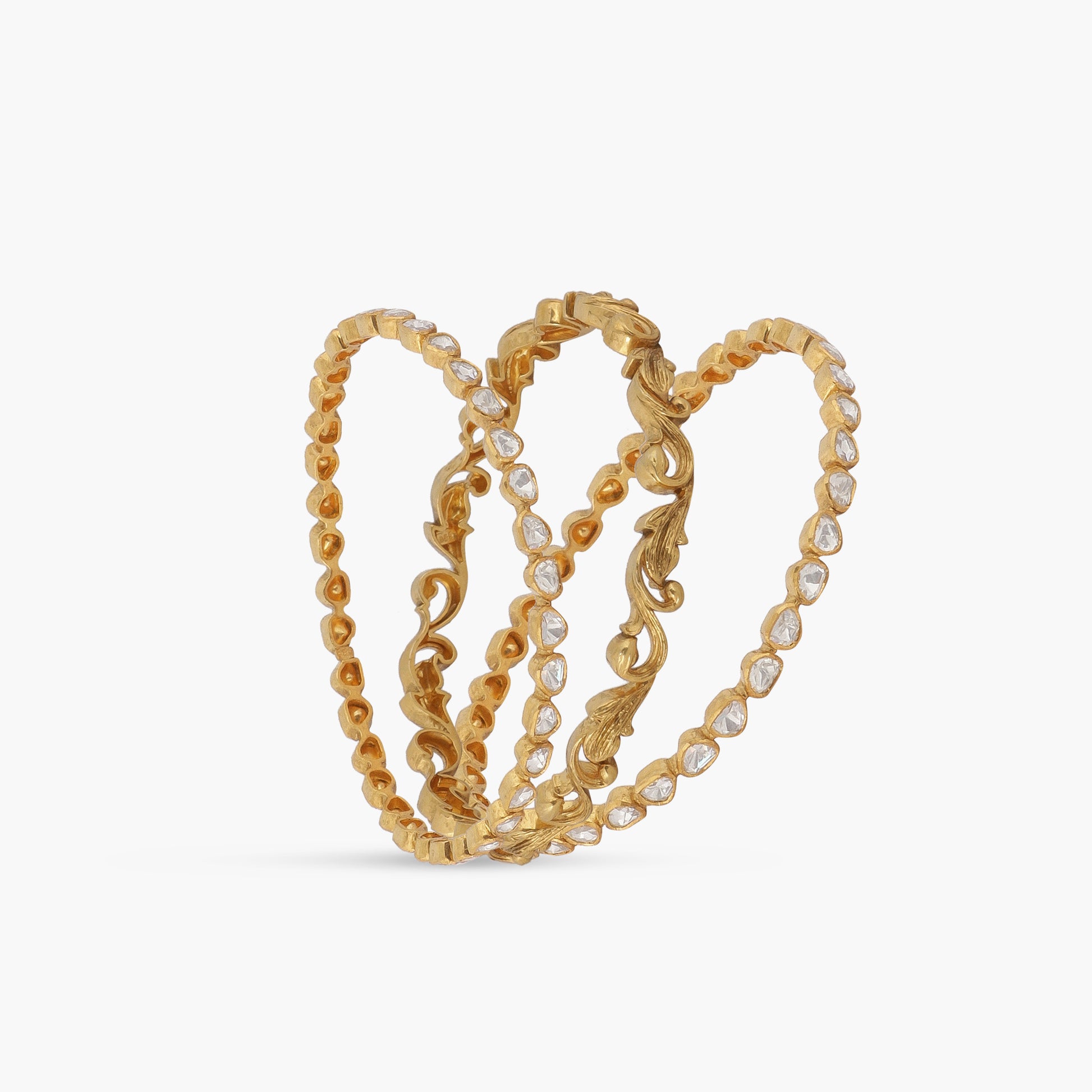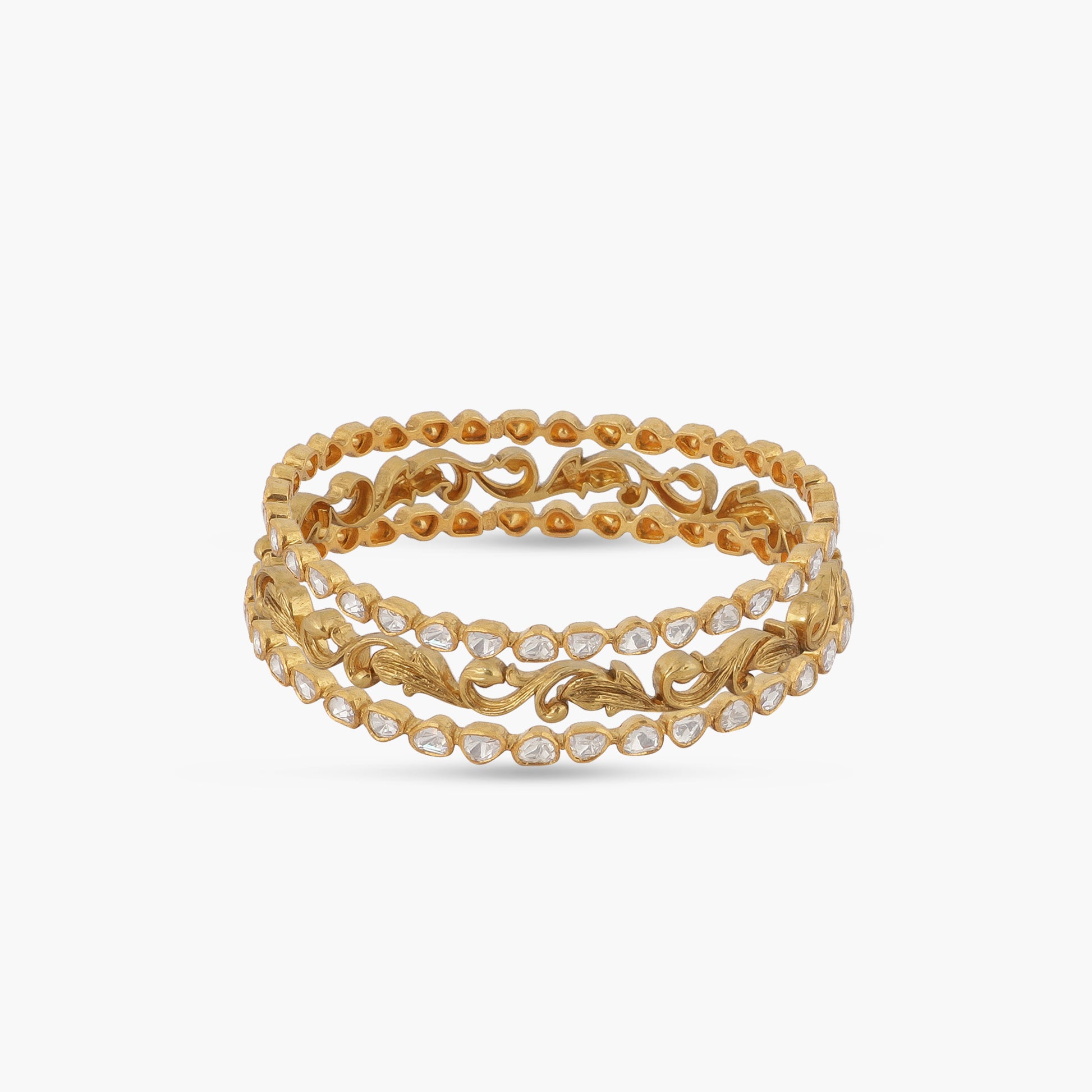 This splendid and ultra-charming silver bangle is handcrafted with twinkling Moissanite layers and overlayed with golden baroque floral patterns which, in turn, is the central focus of this elegant and pristine bangle. It is artfully crafted in antique gold plated 925 Silver. The beautiful bangle is easy to stack with other bangles.