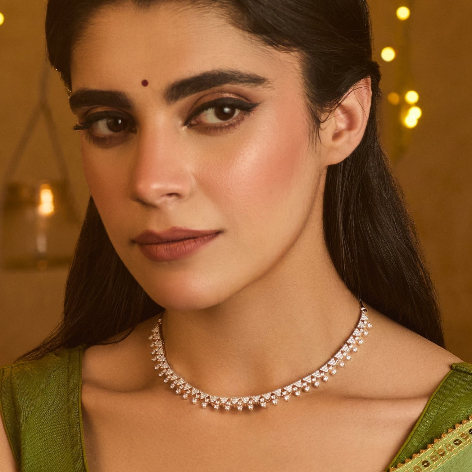 A statement in dainty grandeur, this 925-silver necklace combines intricate CZ artistry with refined proportions. Perfect for festive soirées, weddings, or evening events where you want to stand out with grace.