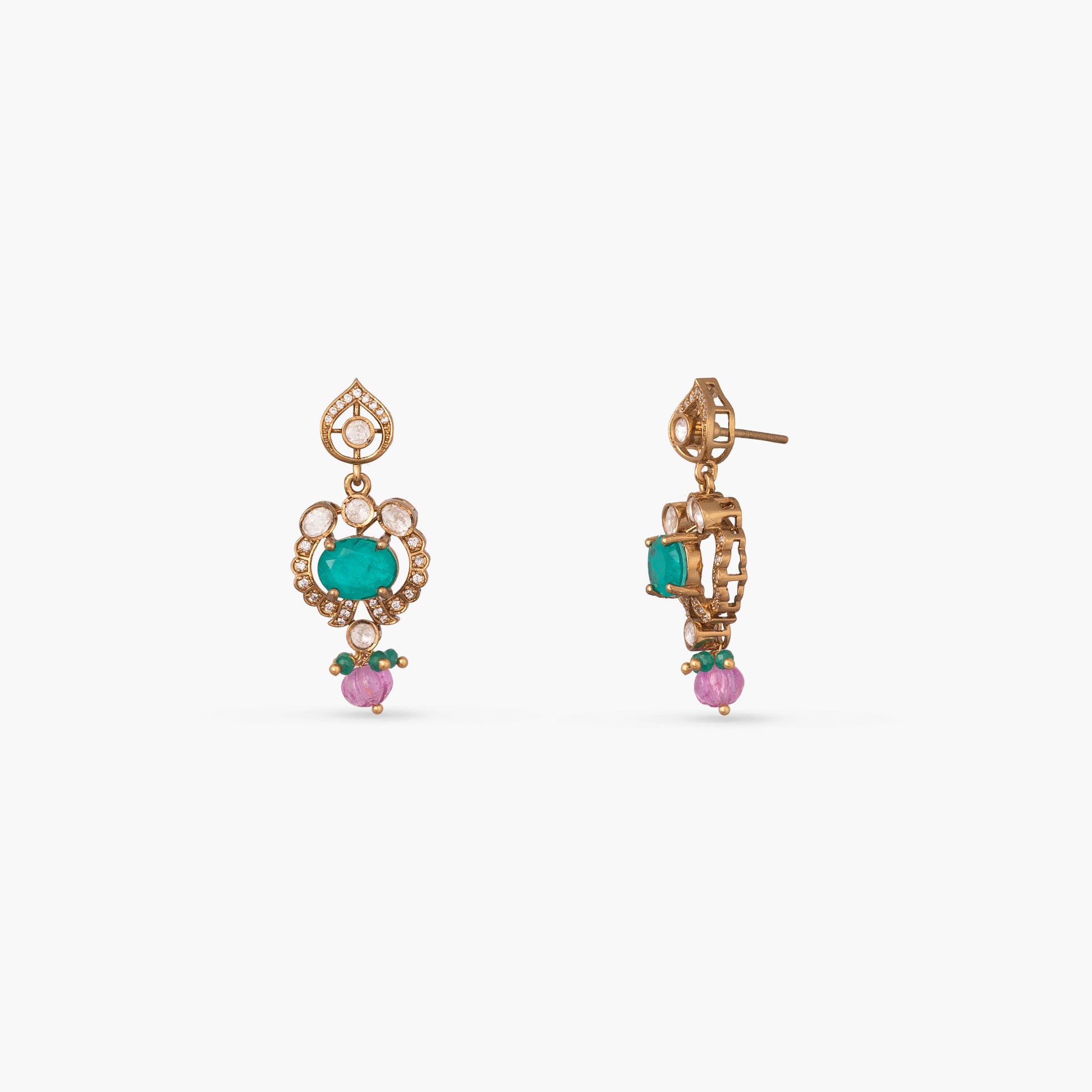 A refined multi-line 925 silver necklace set with moissanite and green stones. Light on the neck yet visually grand, it suits festivals, weddings, and family functions. Style with silk sarees, lehengas, or cocktail dresses for polished sparkle.